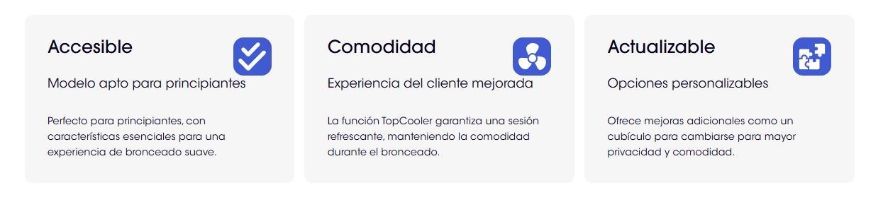 Instalación mínima. Máximo impacto. El Ultrasun E5 ofrece un bronceado eficiente y uniforme que aumenta los niveles de vitamina D y mejora tu tez. Las mejoras opcionales, como un cubículo cambiador, ofrecen mayor privacidad y comodidad para una sesión de bronceado personalizada.