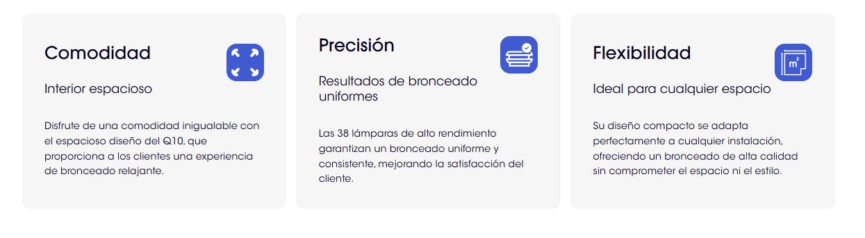 Mejore su experiencia de bronceado con el Ultrasun Q10. Este modelo clásico combina la comodidad de un espacio amplio con un diseño elegante, creando un ambiente sereno y lujoso para cada sesión. Una opción atemporal para salones enfocados en la relajación del cliente.